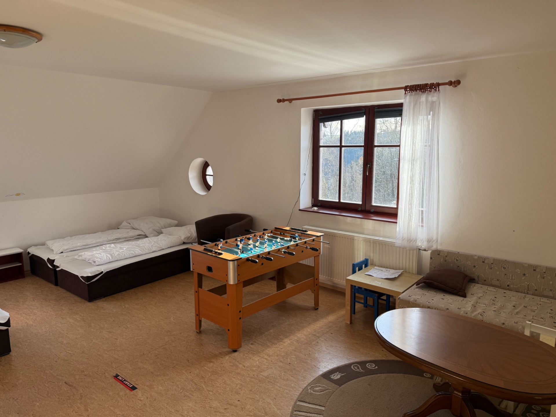 Vnitřní herna Největší pokoj poslouží i jako herna - najdete v něm mj. dětský koutek, šipky nebo stolní fotbálek